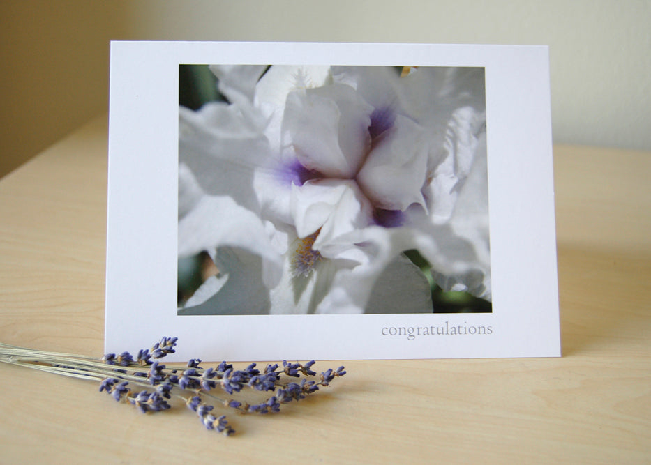Congratulations card with original photograph of iris. Hand-printed on 5 x 7 matte cardstock with envelope.