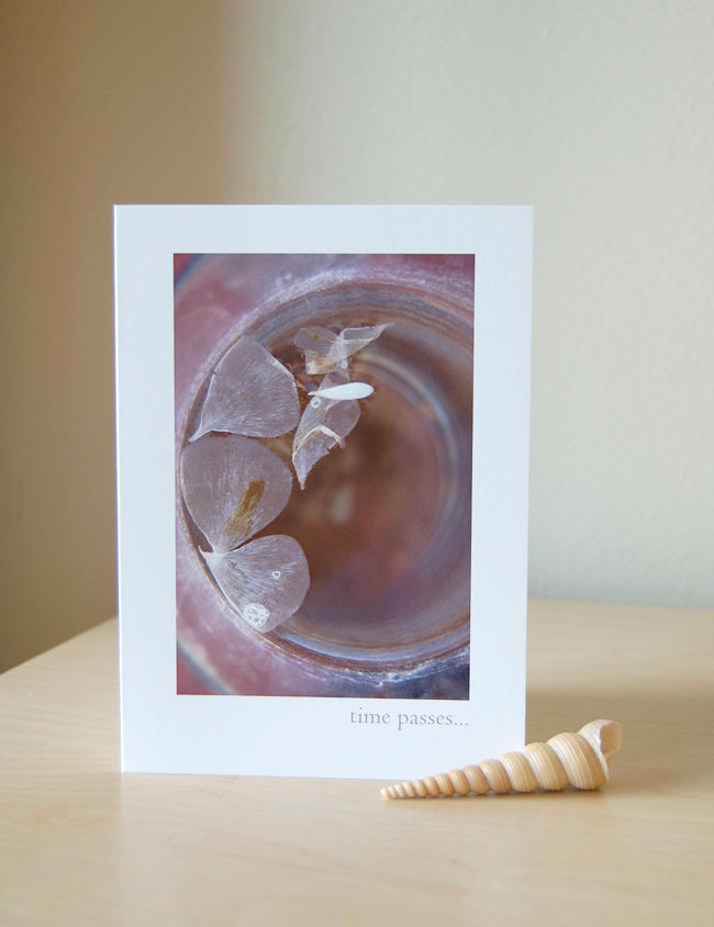 Sympathy or encouragement card with original photograph of flower petals floating in water on front and inside message. Hand-printed on 5 x 7 matte cardstock with envelope.